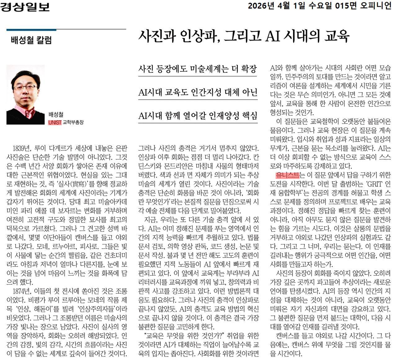 <본 칼럼은 2026년 4월 1일 경상일보 “[배성철 칼럼]사진과 인상파, 그리고 AI 시대의 교육”라는 제목으로 실린 것입니다.>