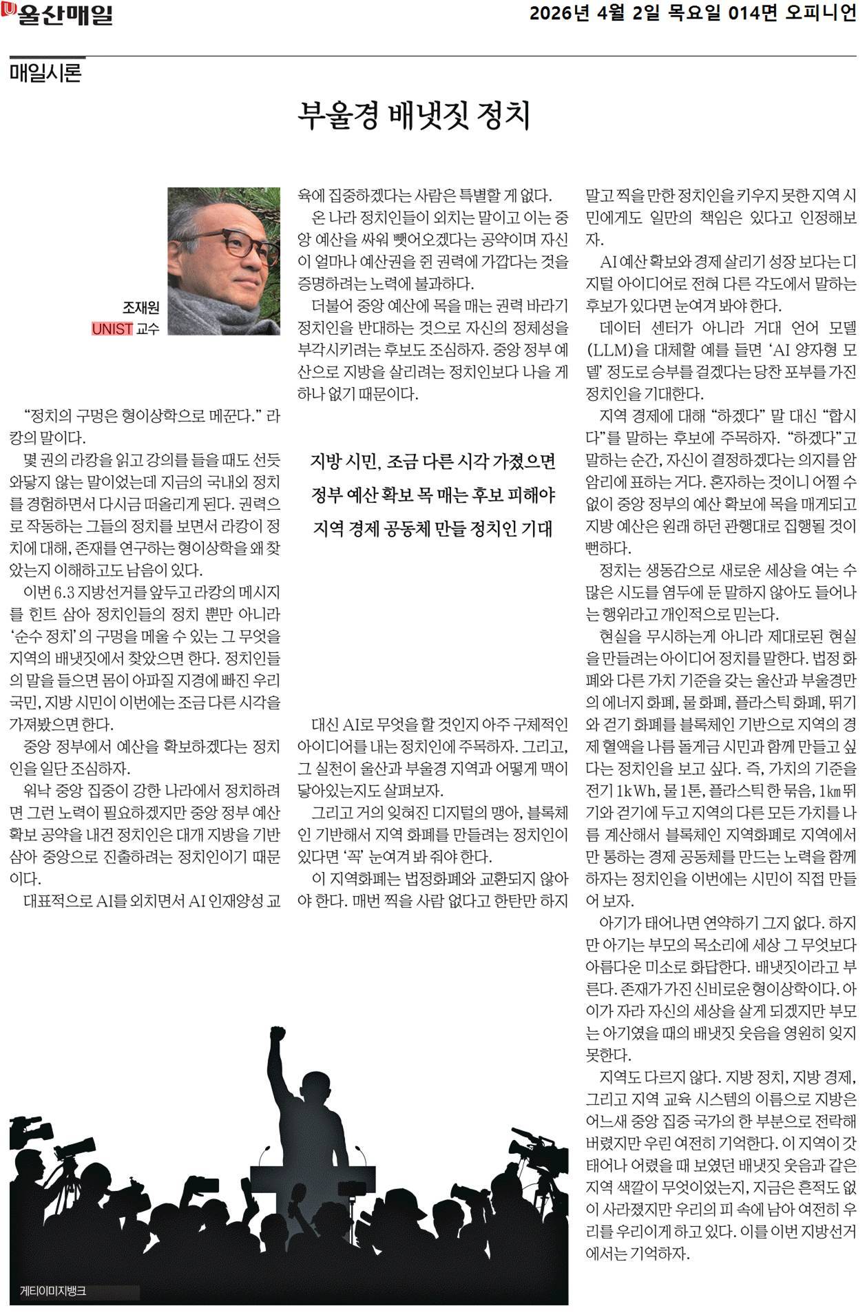 <본 칼럼은 2026년 4월 2일 울산매일 “[매일시론] 부울경 배냇짓 정치”라는 제목으로 실린 것입니다.>
