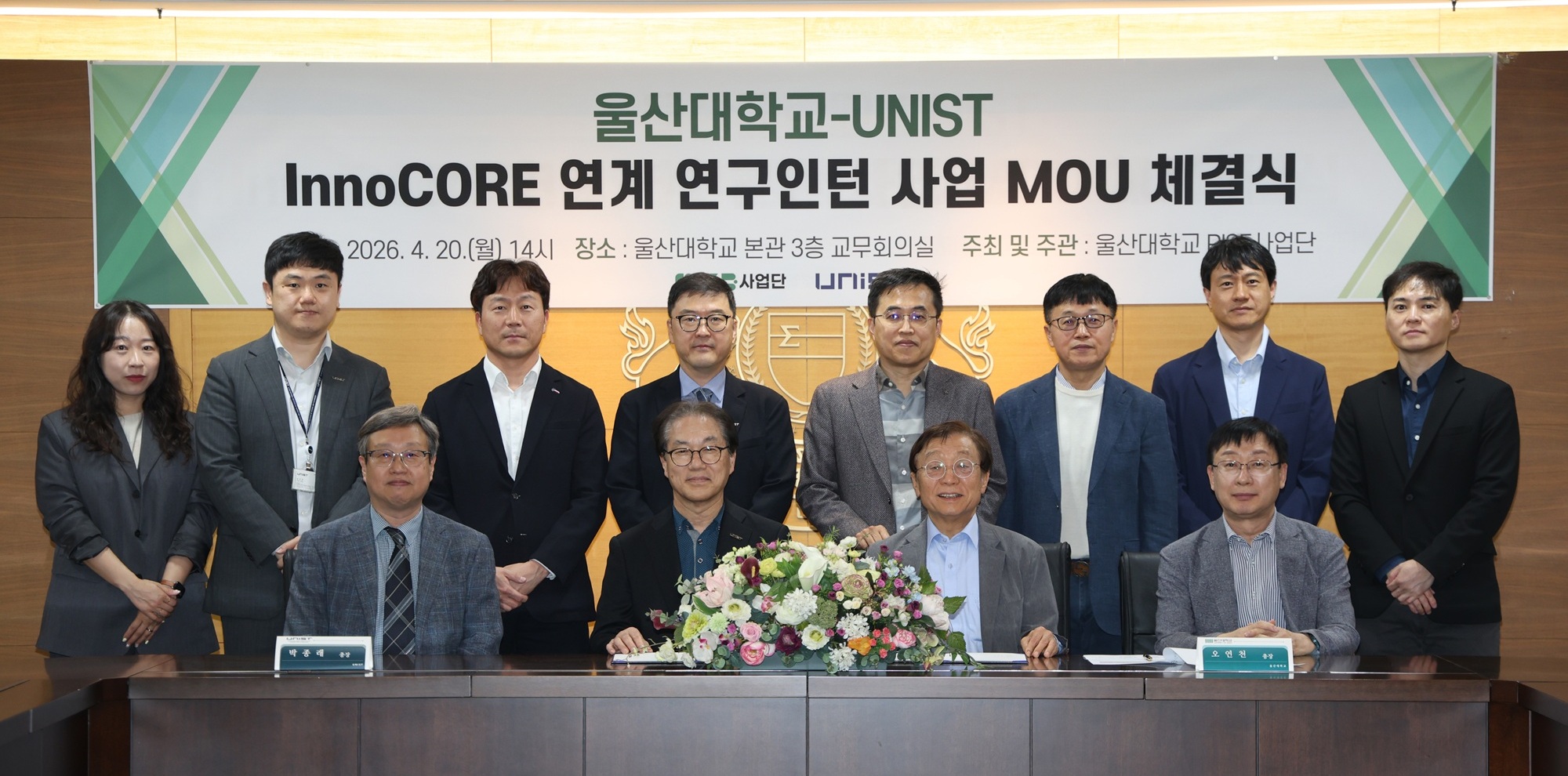 UNIST는 20일(월) 울산대학교와 ‘InnoCORE 연계 연구인턴 사업’ 업무협약을 체결했다. 협약식은 울산대 본관 교무회의실에서 열렸다.