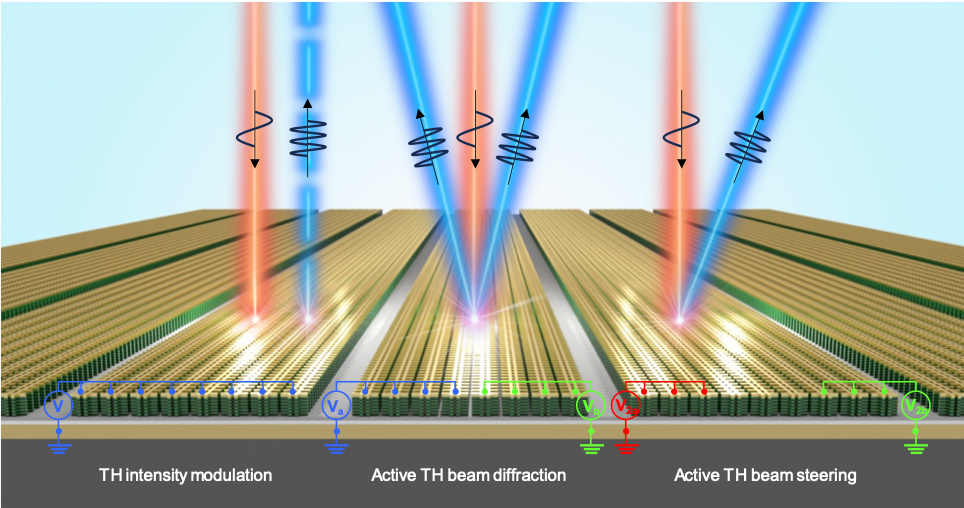 그림1. 전기적 조절이 가능한 제3 고조파 발생 비선형 광학 메타표면 개념도메타아톰 배열에 전압인가 방식에 따라 제3 고조파의 광세기 변조 (좌), 회절특성 변조 (가운데), 빔조향 특성 변조가 가능함.