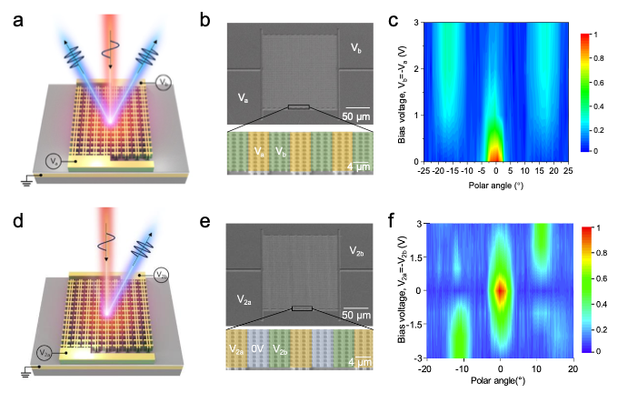 그림2. 전압으로 비선형 광학현상의 세기와 위상을 조절할 수 있는 메타표면(a~c) 전압에 따라 제3고조파의 회절 세기를 조절한 메타표면 광소자. (d~f) 전압에 따라 비선형 광학 위상을 조절하여 빔을 조향한 메타표면 광소자. (a,d) 제3고조파의 전기적 회절특성(a) 및 빔조향 특성(d) 조절 개념도. (b, e) 제작한 비선형 메타표면 주사 전자현미경 이미지. (c) 전압으로 제3고조파의 1차 회절특성을 조절할 수 있다. (f) 전압으로 제3고조파의 빔조향 (진행방향) 특성을 조절할 수 있다. |