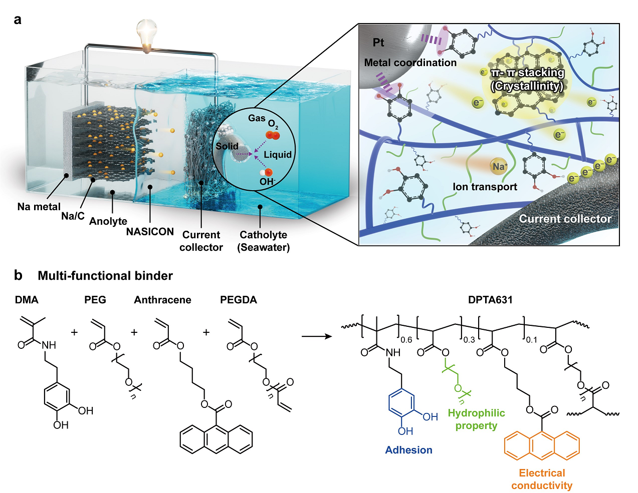 그림 1 해수 전지용 고분자 바인더 제작의 개요 해수 전지 및 개발된 바인더 적용 모식도 (a). 고분자 바인더의 분자 구조식 (b).