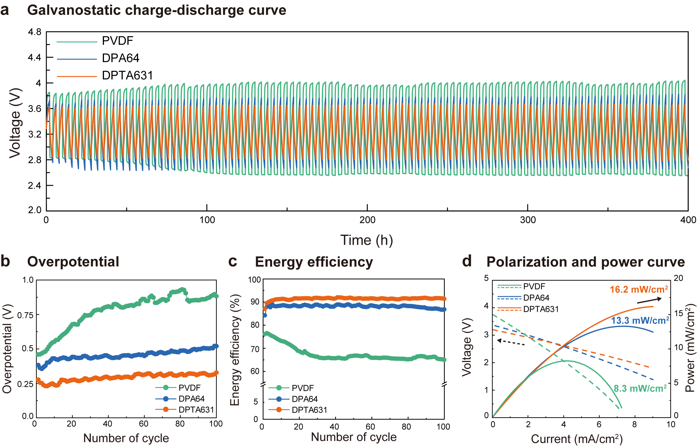 그림 2 전기 화학 테스트 결과 (a) 상용 바인더 (PVDF)와 전도성 그룹 유(DPTA631)무(DPA64)에 따른 충·방전 100사이클 테스트 결과. 각 바인더가 적용된 전극의 (b) 과전압, (c) 에너지 효율 및 (d) 최대 출력 결과. 개발된 바인더 (DPTA631)는 충·방전 100사이클에서 PVDF 대비 과전압 66%, 전압 변화 폭 87% (충·방전 안정성 지표) 감소, 에너지 효율 26%, 최대 출력 95% 향상 결과를 나타냄.