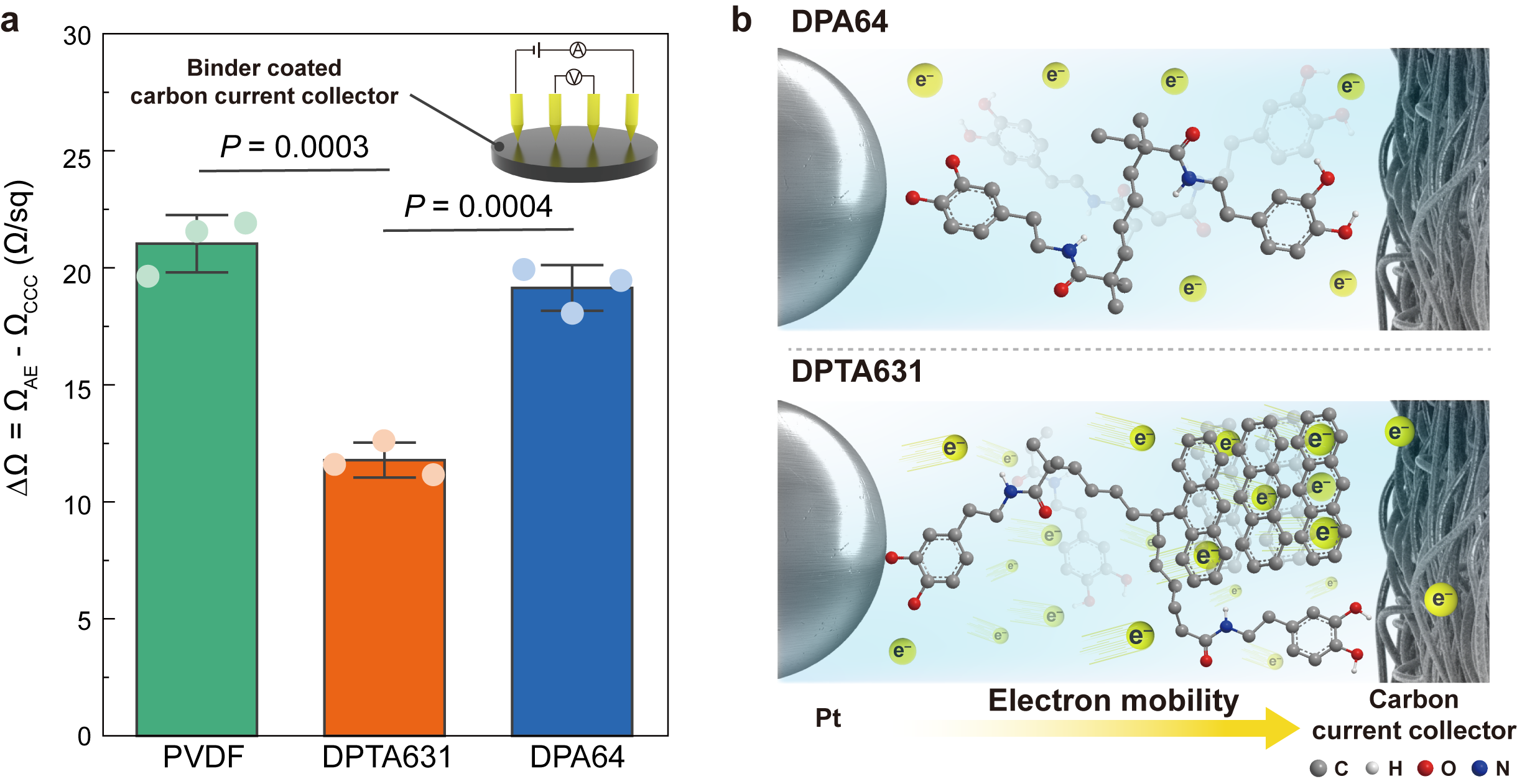 그림 4 개발된 바인더의 전기 전도성 평가 결과 및 모식도 (a) 바인더가 코팅된 전극의 면적 저항 측정 결과. (b) 해수 전지 양극 내 고분자 바인더를 통한 전자 이동 메커니즘 모식도, 전도성 그룹의 π-π 결합으로 인해 효율적인 전자 이동으로 유의미한 전기 전도성 향상 결과를 나타냄.